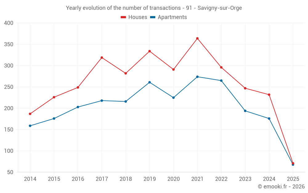 The median price on the 23 house transactions of the last 3 months in the municipality of Savigny-sur-Orge was 3 992 € per square meter for a median property value of 323 380 €. Over this period, 60% of transactions were between 3 384 and 4 614 € per square meter (from the 2nd to the 8th deciles).