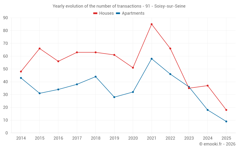The median price on the 18 house transactions of the last 6 months in the municipality of Soisy-sur-Seine was 2 943 € per square meter for a median property value of 387 800 €. Over this period, 60% of transactions were between 2 302 and 3 681 € per square meter (from the 2nd to the 8th deciles).