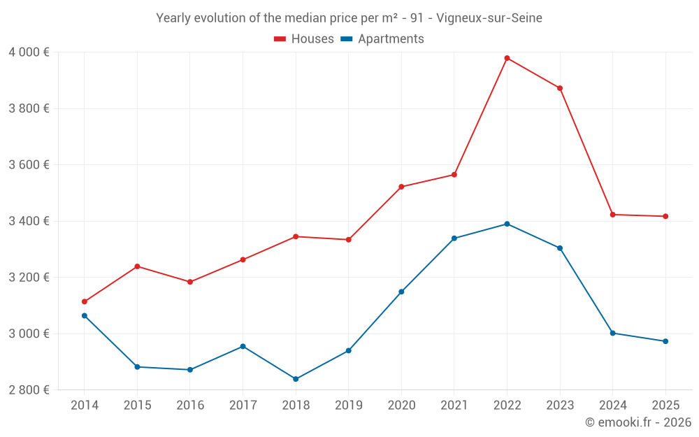 The median price on the 43 house transactions of the last 6 months in the municipality of Vigneux-sur-Seine was 3 417 € per square meter for a median property value of 290 000 €. Over this period, 60% of transactions were between 2 726 and 4 197 € per square meter (from the 2nd to the 8th deciles).