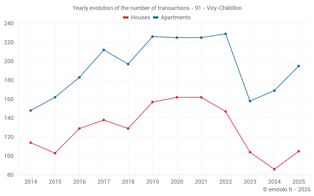 The median price on the 50 apartment transactions of the last 3 months in the municipality of Viry-Châtillon was 2 725 € per square meter for a median property value of 150 500 €. Over this period, 60% of transactions were between 2 078 and 3 291 € per square meter (from the 2nd to the 8th deciles).