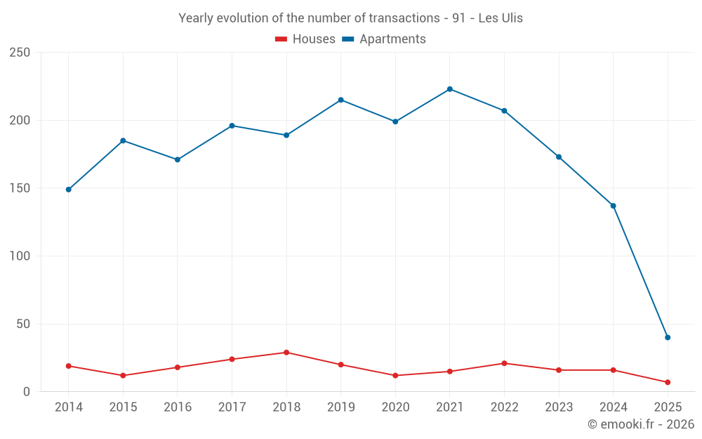 The median price on the 18 house transactions of the last 12 months in the municipality of Les Ulis was 3 242 € per square meter for a median property value of 330 175 €. Over this period, 60% of transactions were between 2 858 and 3 690 € per square meter (from the 2nd to the 8th deciles).