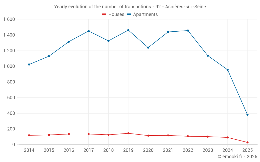 The median price on the 104 apartment transactions of the last 3 months in the municipality of Asnières-sur-Seine was 6 114 € per square meter for a median property value of 274 500 €. Over this period, 60% of transactions were between 4 482 and 7 167 € per square meter (from the 2nd to the 8th deciles).