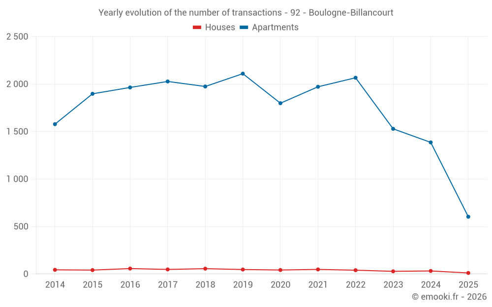 The median price on the 34 house transactions of the last 12 months in the municipality of Boulogne-Billancourt was 12 810 € per square meter for a median property value of 1 875 000 €. Over this period, 60% of transactions were between 8 980 and 17 901 € per square meter (from the 2nd to the 8th deciles).