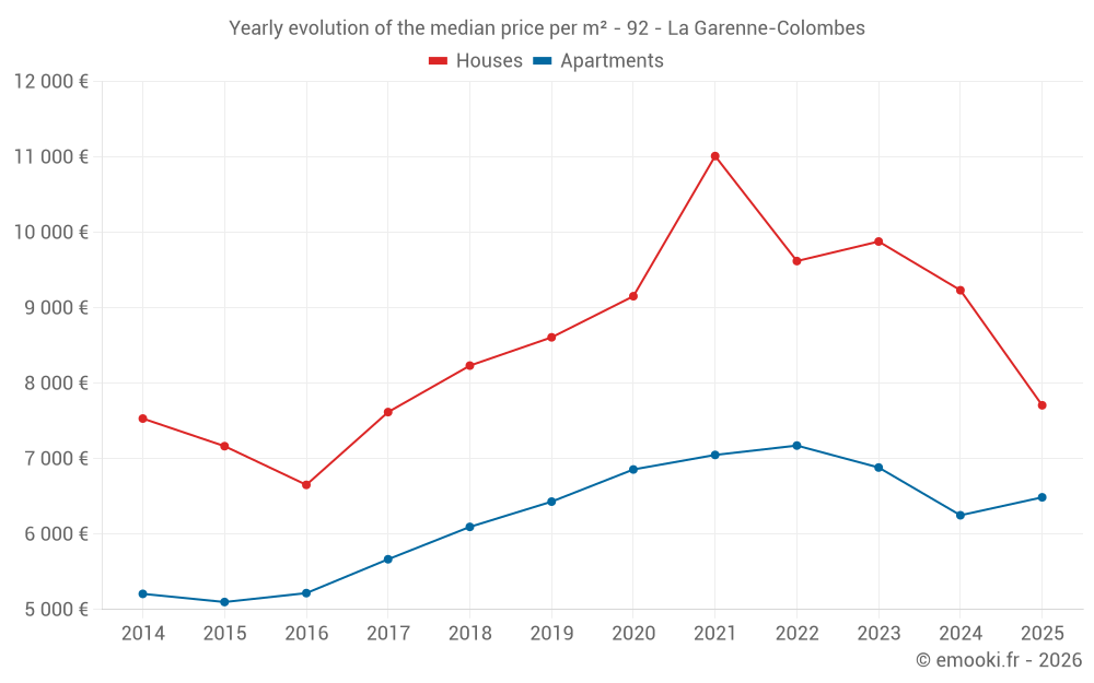 The median price on the 30 house transactions of the last 12 months in the municipality of La Garenne-Colombes was 8 920 € per square meter for a median property value of 881 950 €. Over this period, 60% of transactions were between 7 088 and 10 798 € per square meter (from the 2nd to the 8th deciles).