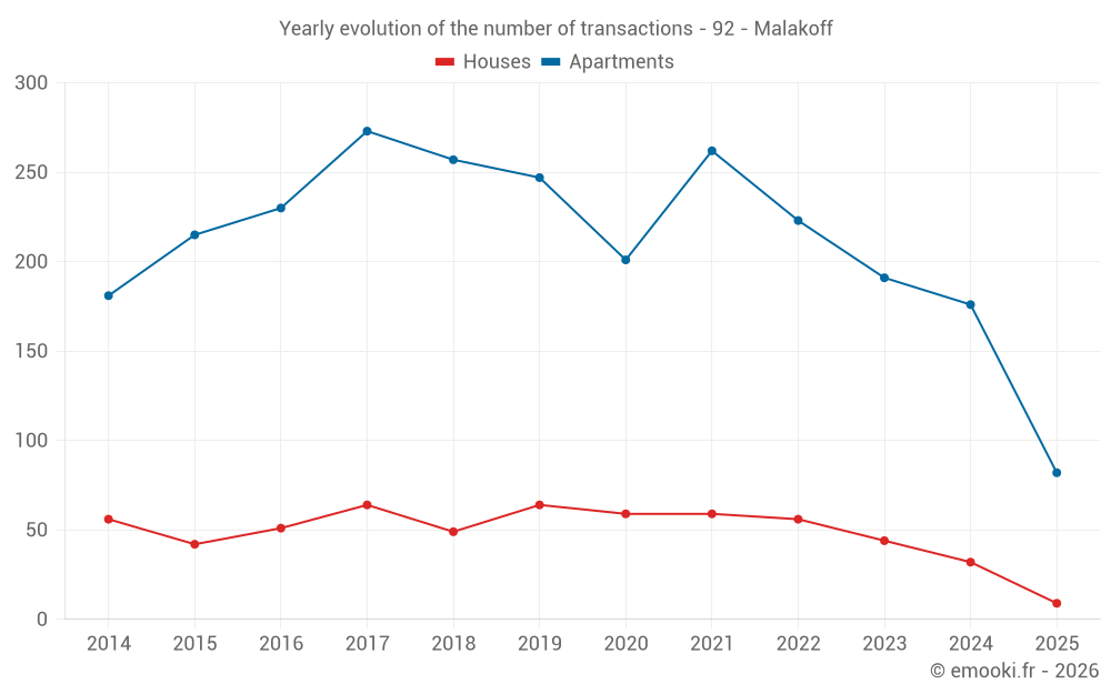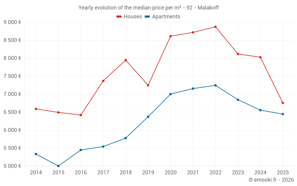 The median price on the 32 house transactions of the last 12 months in the municipality of Malakoff was 7 658 € per square meter for a median property value of 727 500 €. Over this period, 60% of transactions were between 5 962 and 9 346 € per square meter (from the 2nd to the 8th deciles).