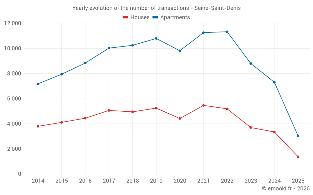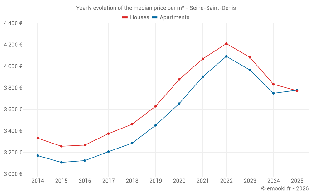 The median price on the 474 house transactions of the last 3 months in the Seine-Saint-Denis department was 3 922 € per square meter for a median property value of 330 000 €. Over this period, 60% of transactions were between 2 854 and 5 425 € per square meter (from the 2nd to the 8th deciles).