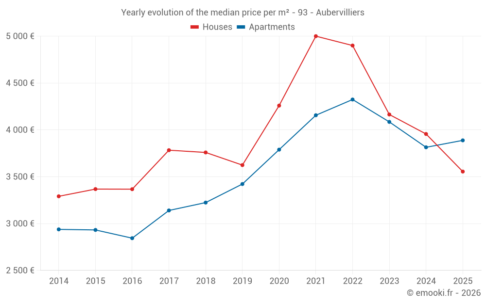 The median price on the 78 apartment transactions of the last 3 months in the municipality of Aubervilliers was 3 682 € per square meter for a median property value of 154 250 €. Over this period, 60% of transactions were between 2 712 and 4 400 € per square meter (from the 2nd to the 8th deciles).