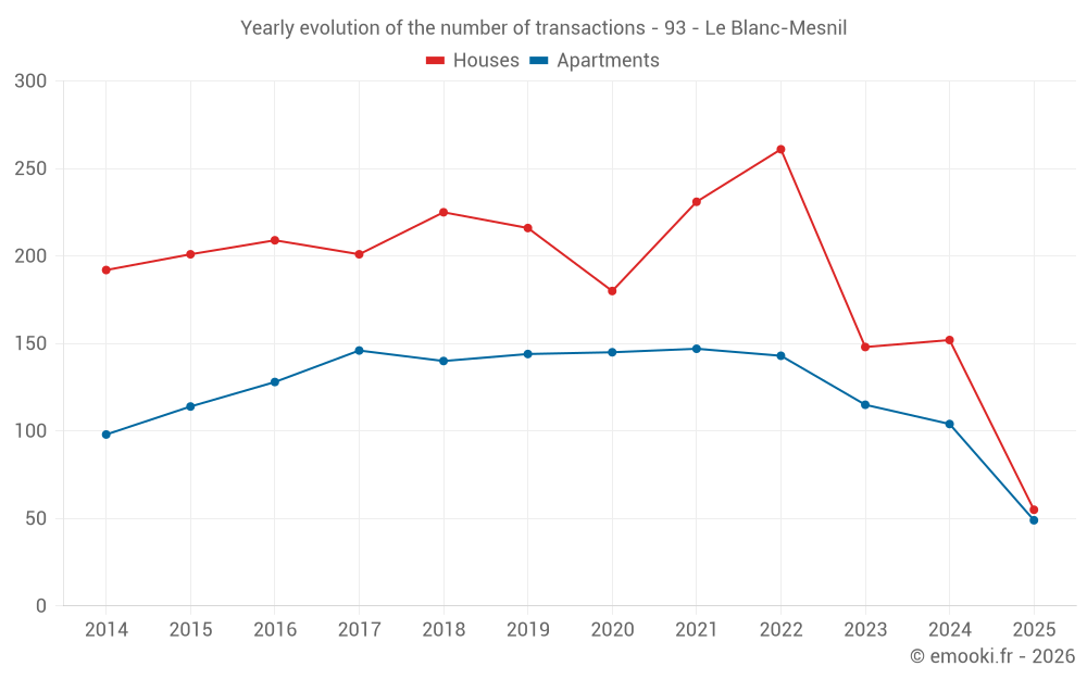 The median price on the 49 apartment transactions of the last 6 months in the municipality of Le Blanc-Mesnil was 3 273 € per square meter for a median property value of 184 000 €. Over this period, 60% of transactions were between 2 692 and 4 063 € per square meter (from the 2nd to the 8th deciles).