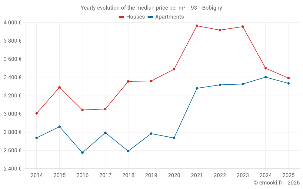 The median price on the 30 house transactions of the last 6 months in the municipality of Bobigny was 3 392 € per square meter for a median property value of 262 500 €. Over this period, 60% of transactions were between 2 560 and 5 176 € per square meter (from the 2nd to the 8th deciles).