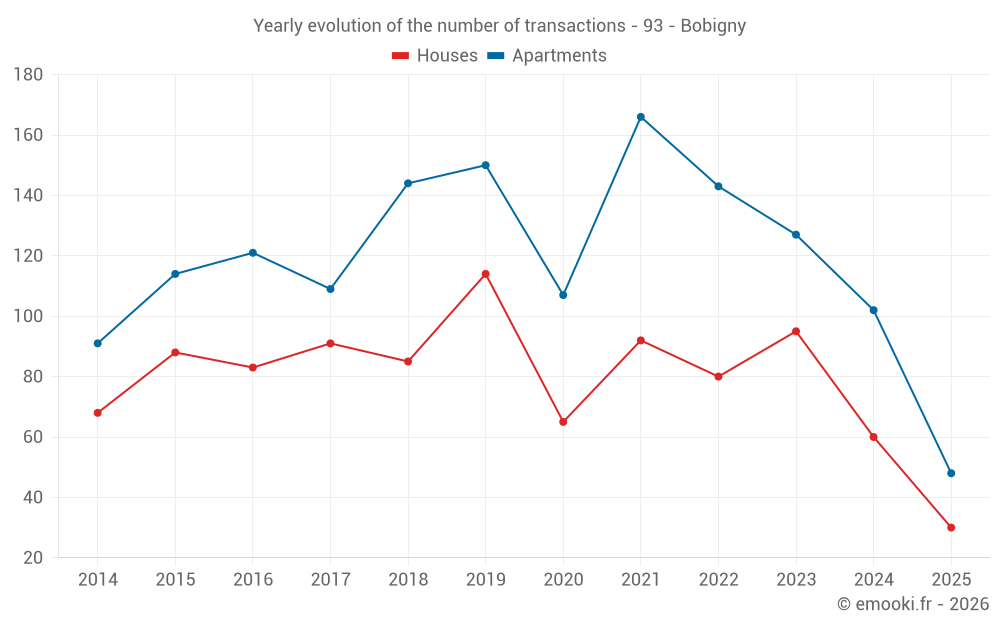 The median price on the 24 apartment transactions of the last 3 months in the municipality of Bobigny was 3 334 € per square meter for a median property value of 165 000 €. Over this period, 60% of transactions were between 2 606 and 4 050 € per square meter (from the 2nd to the 8th deciles).