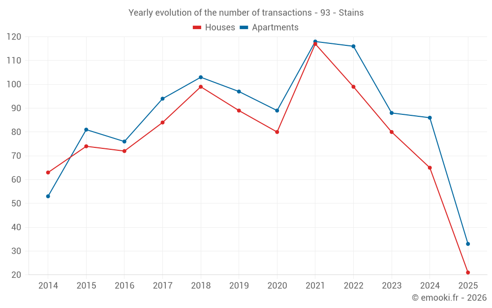 The median price on the 21 house transactions of the last 6 months in the municipality of Stains was 2 949 € per square meter for a median property value of 263 000 €. Over this period, 60% of transactions were between 2 039 and 4 123 € per square meter (from the 2nd to the 8th deciles).