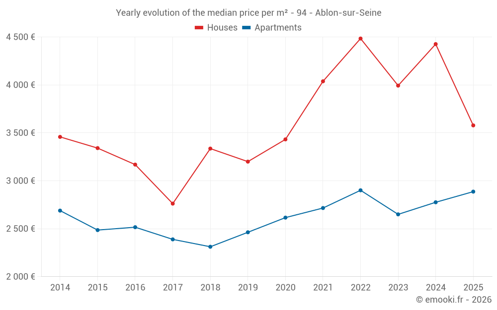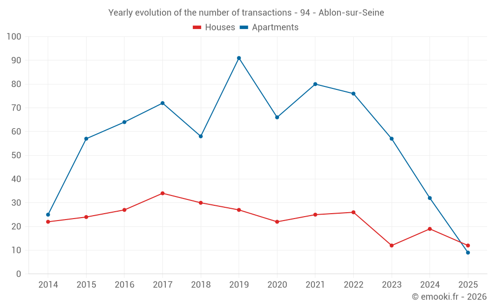 The median price on the 23 house transactions of the last 12 months in the municipality of Ablon-sur-Seine was 4 032 € per square meter for a median property value of 335 000 €. Over this period, 60% of transactions were between 3 186 and 4 488 € per square meter (from the 2nd to the 8th deciles).