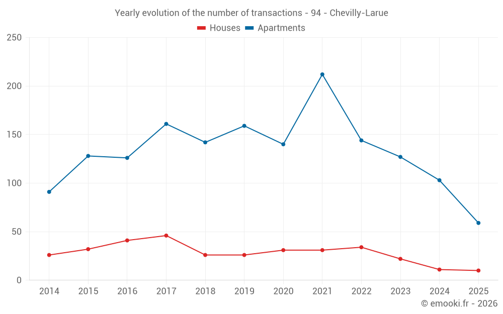 The median price on the 59 apartment transactions of the last 6 months in the municipality of Chevilly-Larue was 3 313 € per square meter for a median property value of 208 000 €. Over this period, 60% of transactions were between 2 748 and 4 678 € per square meter (from the 2nd to the 8th deciles).