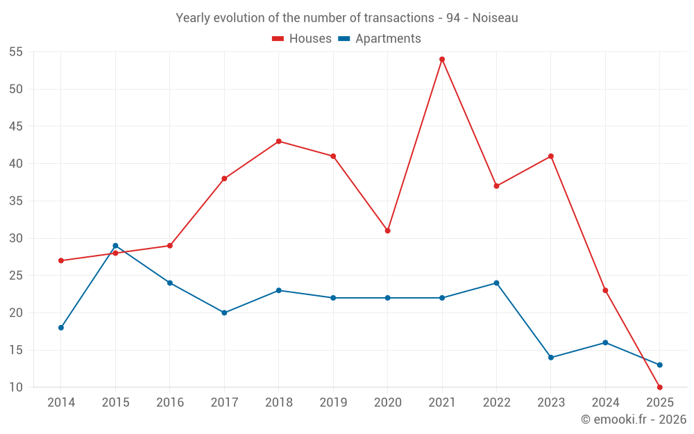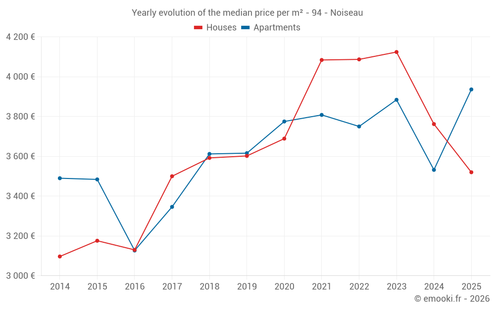 The median price on the 24 house transactions of the last 12 months in the municipality of Noiseau was 3 746 € per square meter for a median property value of 364 750 €. Over this period, 60% of transactions were between 3 278 and 5 399 € per square meter (from the 2nd to the 8th deciles).