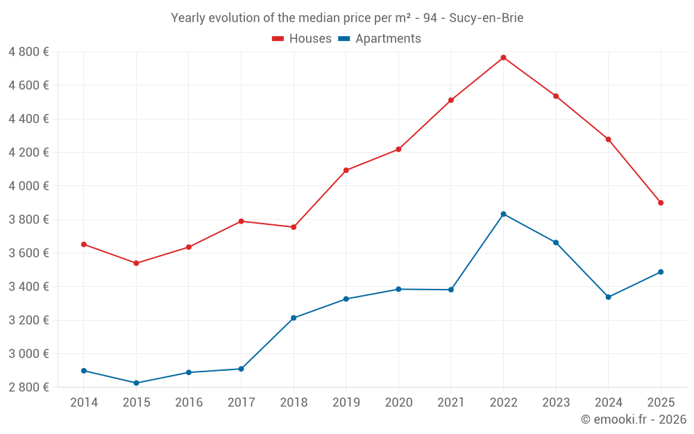 The median price on the 43 house transactions of the last 6 months in the municipality of Sucy-en-Brie was 3 900 € per square meter for a median property value of 405 000 €. Over this period, 60% of transactions were between 3 072 and 4 540 € per square meter (from the 2nd to the 8th deciles).