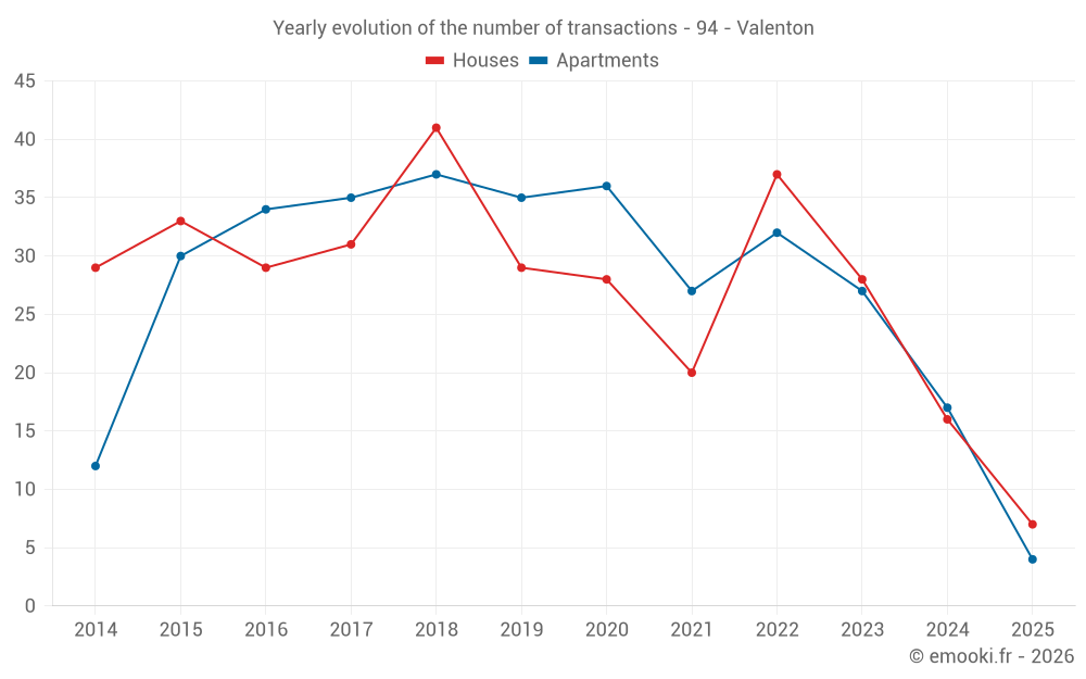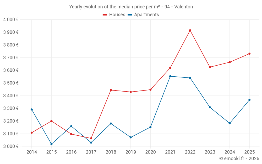 The median price on the 17 house transactions of the last 12 months in the municipality of Valenton was 3 731 € per square meter for a median property value of 300 000 €. Over this period, 60% of transactions were between 3 142 and 4 199 € per square meter (from the 2nd to the 8th deciles).