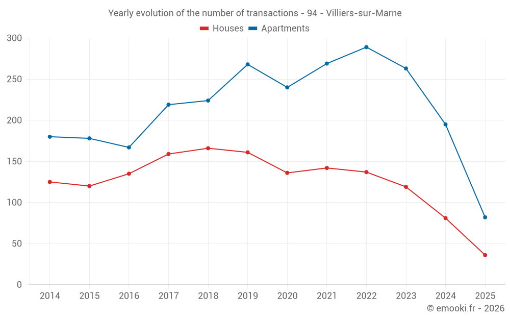 The median price on the 36 house transactions of the last 6 months in the municipality of Villiers-sur-Marne was 3 644 € per square meter for a median property value of 430 700 €. Over this period, 60% of transactions were between 3 232 and 4 788 € per square meter (from the 2nd to the 8th deciles).