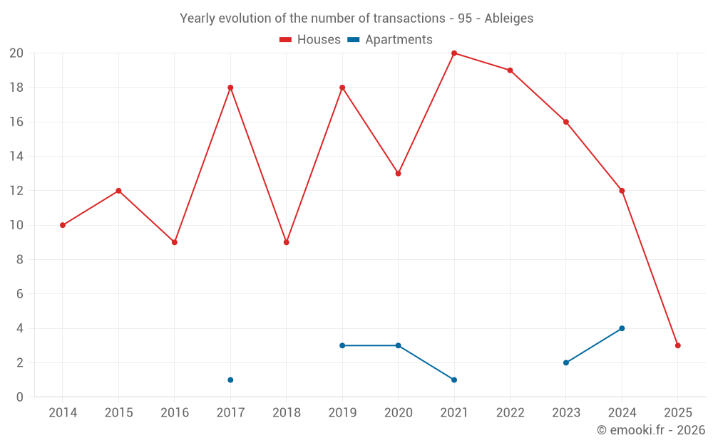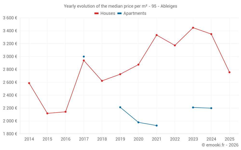 The median price on the 24 house transactions of the last 24 months in the municipality of Ableiges was 3 312 € per square meter for a median property value of 348 552 €. Over this period, 60% of transactions were between 2 444 and 4 008 € per square meter (from the 2nd to the 8th deciles).