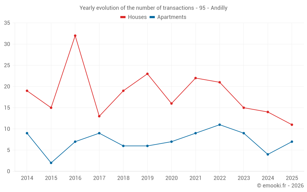 The median price on the 25 house transactions of the last 24 months in the municipality of Andilly was 3 779 € per square meter for a median property value of 568 000 €. Over this period, 60% of transactions were between 3 119 and 4 457 € per square meter (from the 2nd to the 8th deciles).