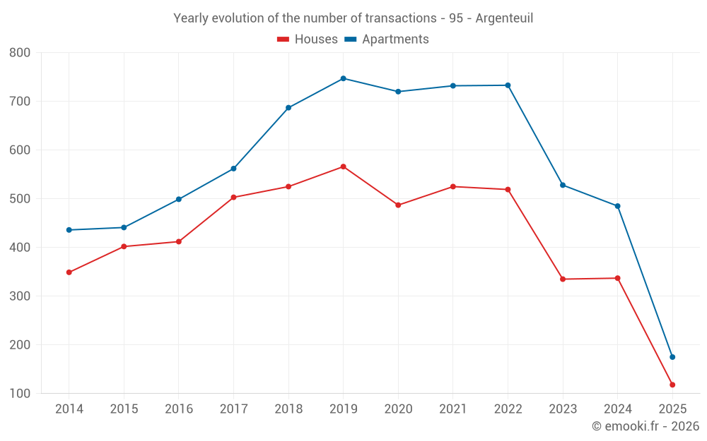The median price on the 48 house transactions of the last 3 months in the municipality of Argenteuil was 4 112 € per square meter for a median property value of 287 500 €. Over this period, 60% of transactions were between 3 171 and 5 137 € per square meter (from the 2nd to the 8th deciles).