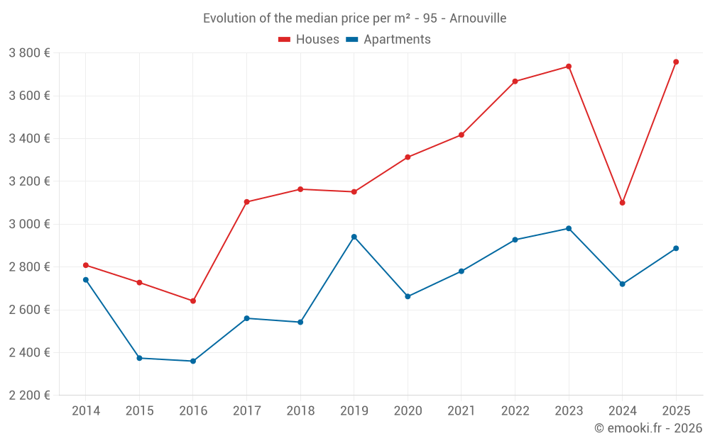 The median price on the 26 house transactions of the last 6 months in the municipality of Arnouville was 3 758 € per square meter for a median property value of 300 000 €. Over this period, 60% of transactions were between 3 000 and 4 929 € per square meter (from the 2nd to the 8th deciles).