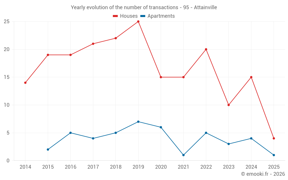 The median price on the 24 house transactions of the last 24 months in the municipality of Attainville was 3 544 € per square meter for a median property value of 372 500 €. Over this period, 60% of transactions were between 2 928 and 4 166 € per square meter (from the 2nd to the 8th deciles).
