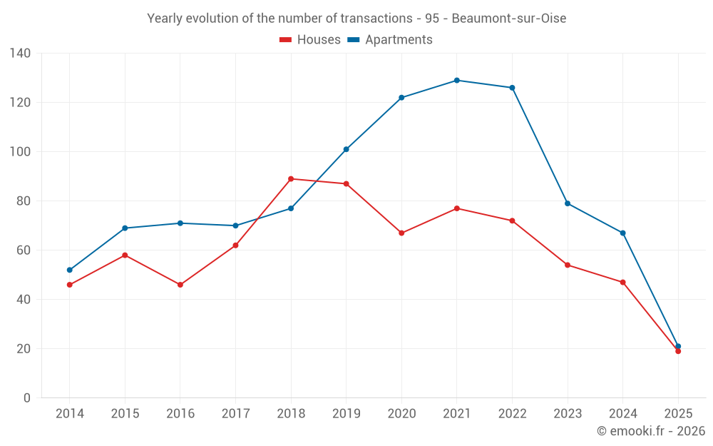 The median price on the 21 apartment transactions of the last 6 months in the municipality of Beaumont-sur-Oise was 2 713 € per square meter for a median property value of 119 000 €. Over this period, 60% of transactions were between 2 378 and 3 000 € per square meter (from the 2nd to the 8th deciles).