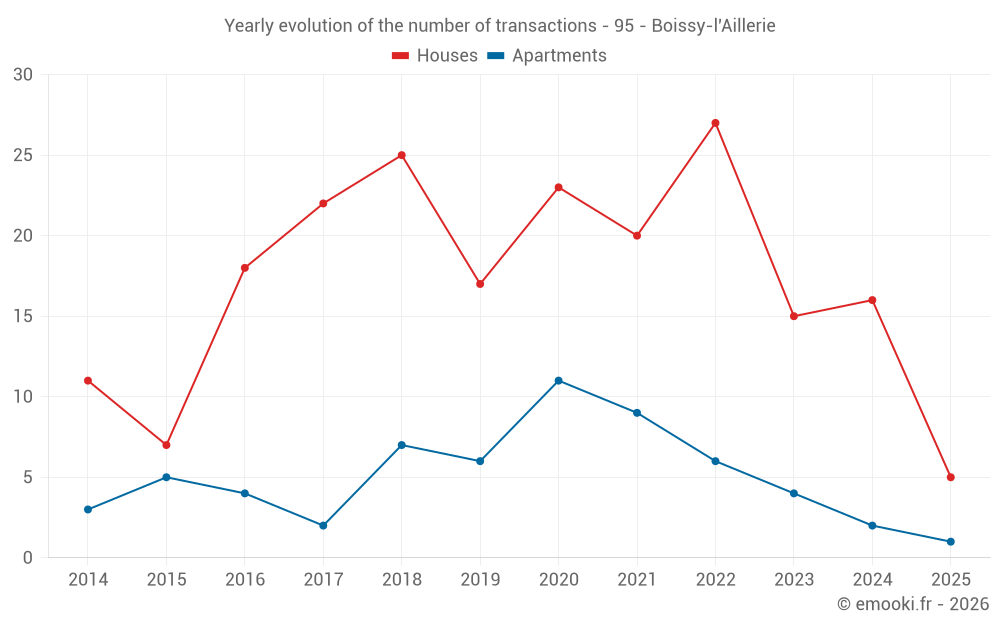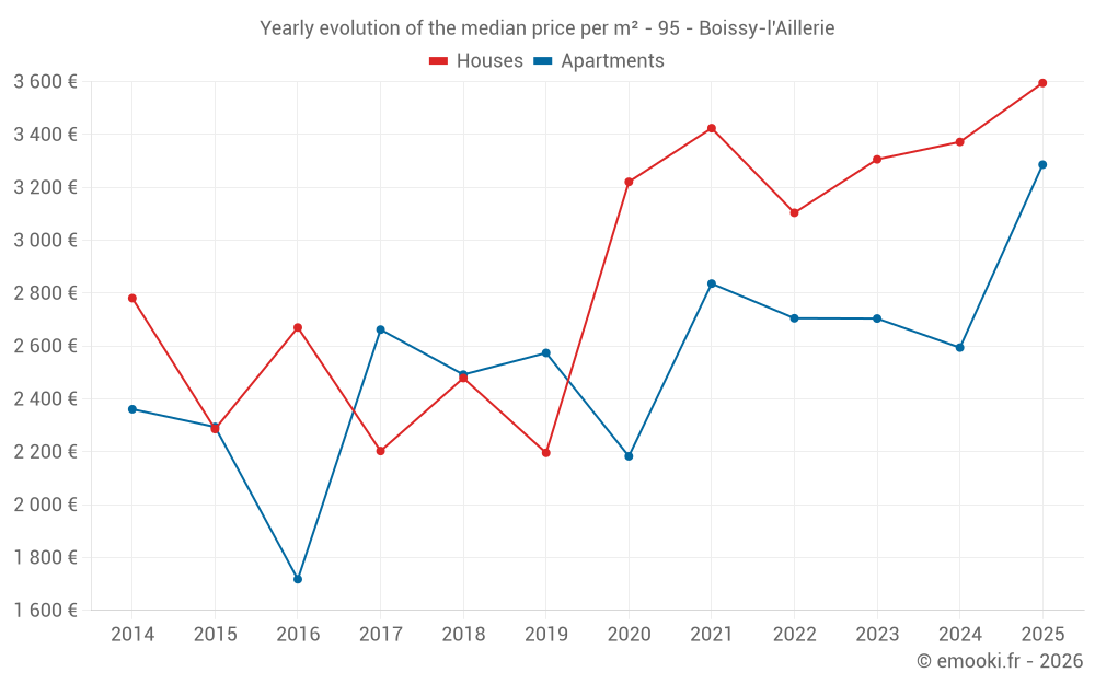 The median price on the 28 house transactions of the last 24 months in the municipality of Boissy-l'Aillerie was 3 378 € per square meter for a median property value of 367 175 €. Over this period, 60% of transactions were between 2 569 and 3 770 € per square meter (from the 2nd to the 8th deciles).
