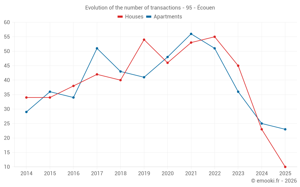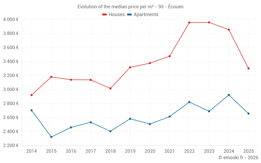 The median price on the 22 house transactions of the last 12 months in the municipality of Écouen was 3 844 € per square meter for a median property value of 342 500 €. Over this period, 60% of transactions were between 3 271 and 4 445 € per square meter (from the 2nd to the 8th deciles).