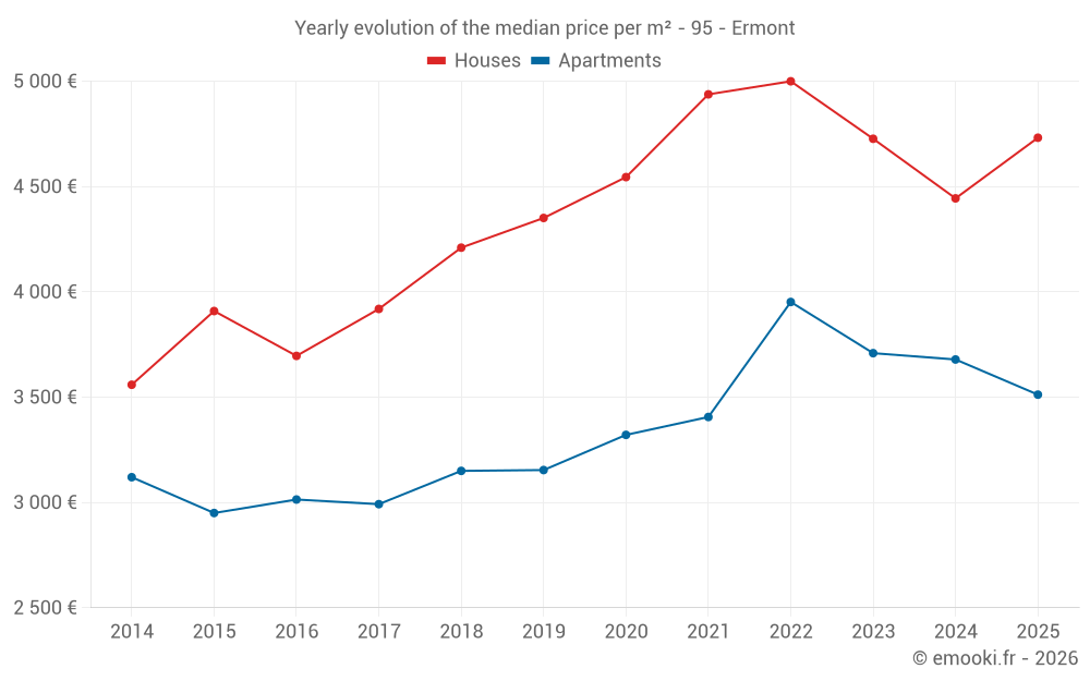 The median price on the 50 house transactions of the last 6 months in the municipality of Ermont was 4 732 € per square meter for a median property value of 458 550 €. Over this period, 60% of transactions were between 3 727 and 6 448 € per square meter (from the 2nd to the 8th deciles).