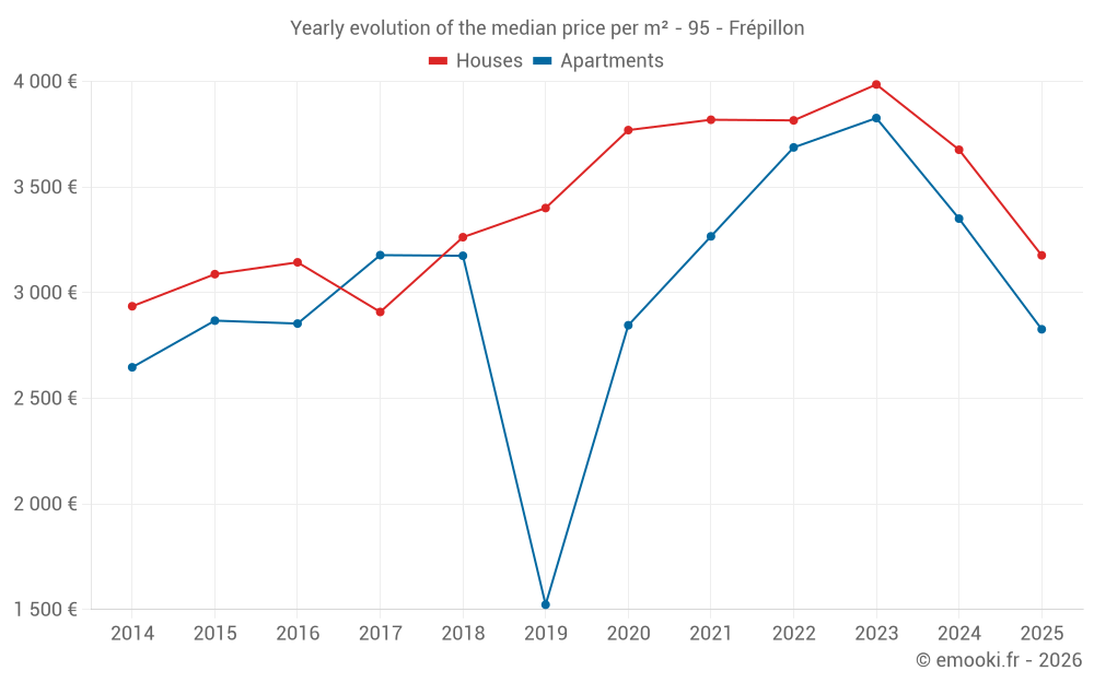 The median price on the 23 house transactions of the last 12 months in the municipality of Frépillon was 3 308 € per square meter for a median property value of 310 000 €. Over this period, 60% of transactions were between 2 807 and 3 966 € per square meter (from the 2nd to the 8th deciles).