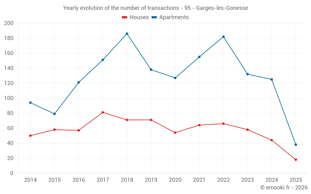 The median price on the 38 apartment transactions of the last 6 months in the municipality of Garges-lès-Gonesse was 2 204 € per square meter for a median property value of 139 000 €. Over this period, 60% of transactions were between 1 858 and 2 590 € per square meter (from the 2nd to the 8th deciles).