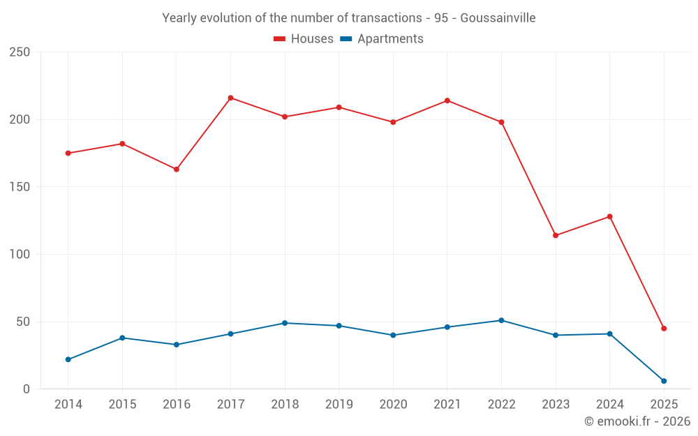 The median price on the 20 house transactions of the last 3 months in the municipality of Goussainville was 3 241 € per square meter for a median property value of 251 000 €. Over this period, 60% of transactions were between 2 755 and 4 063 € per square meter (from the 2nd to the 8th deciles).