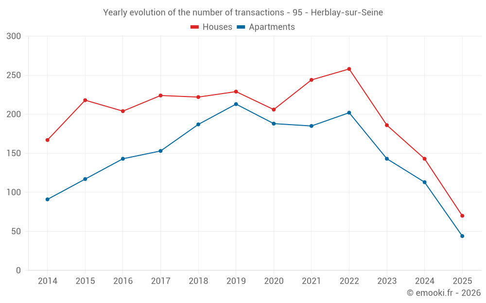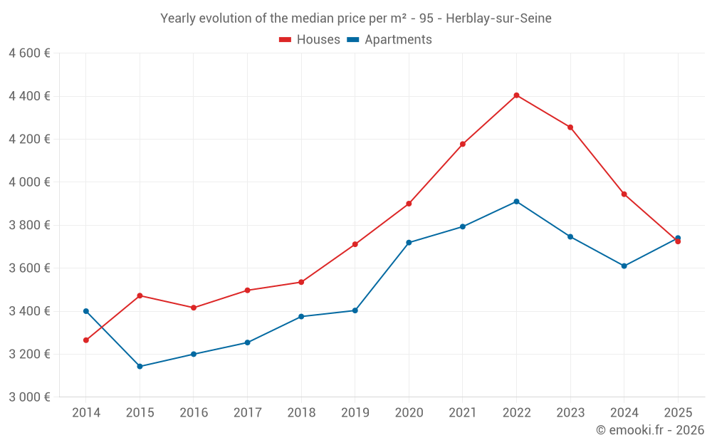 The median price on the 44 apartment transactions of the last 6 months in the municipality of Herblay-sur-Seine was 3 740 € per square meter for a median property value of 186 500 €. Over this period, 60% of transactions were between 3 089 and 4 256 € per square meter (from the 2nd to the 8th deciles).
