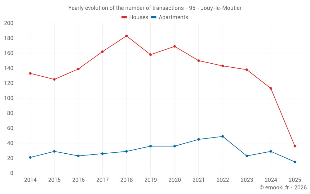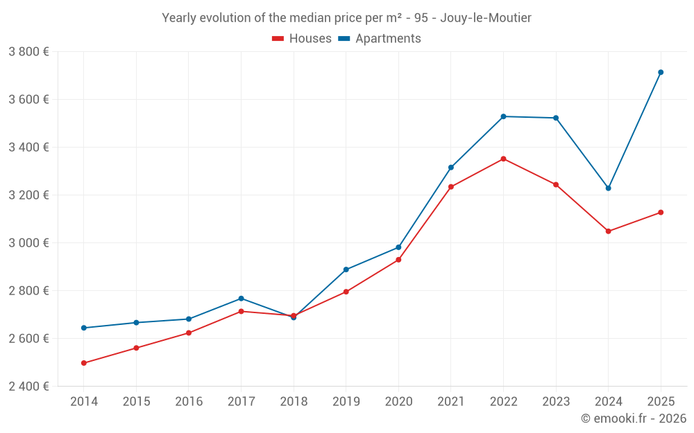 The median price on the 36 house transactions of the last 6 months in the municipality of Jouy-le-Moutier was 3 128 € per square meter for a median property value of 286 000 €. Over this period, 60% of transactions were between 2 668 and 3 494 € per square meter (from the 2nd to the 8th deciles).