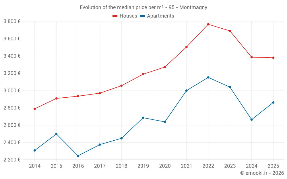 The median price on the 22 house transactions of the last 6 months in the municipality of Montmagny was 3 380 € per square meter for a median property value of 274 000 €. Over this period, 60% of transactions were between 2 898 and 4 348 € per square meter (from the 2nd to the 8th deciles).