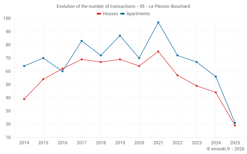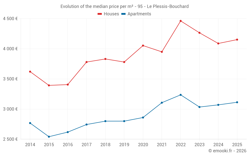 The median price on the 21 apartment transactions of the last 6 months in the municipality of Le Plessis-Bouchard was 3 113 € per square meter for a median property value of 195 120 €. Over this period, 60% of transactions were between 2 605 and 3 409 € per square meter (from the 2nd to the 8th deciles).
