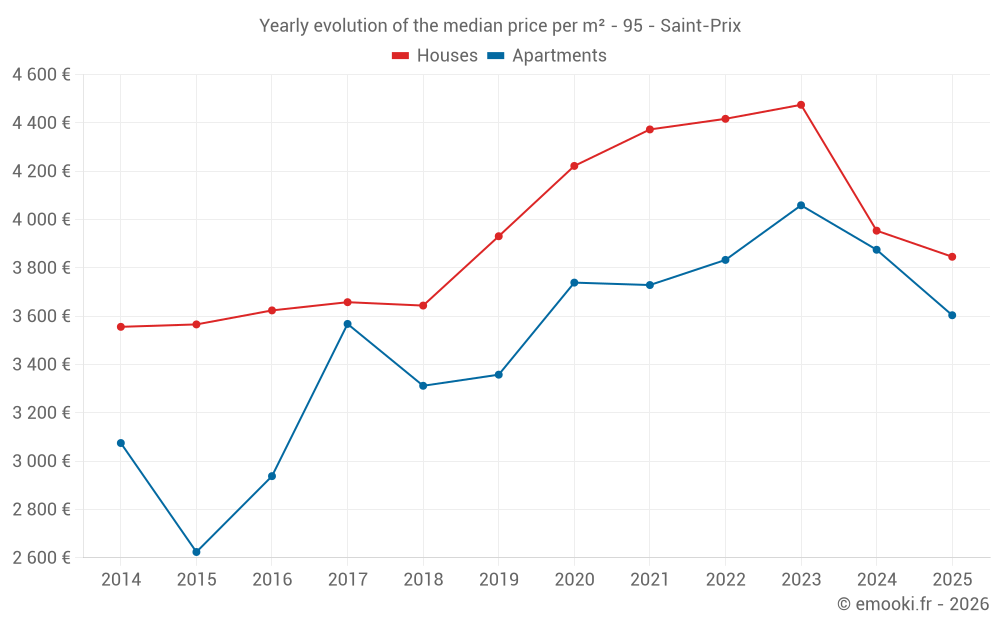 The median price on the 21 house transactions of the last 6 months in the municipality of Saint-Prix was 3 846 € per square meter for a median property value of 405 350 €. Over this period, 60% of transactions were between 3 398 and 4 350 € per square meter (from the 2nd to the 8th deciles).