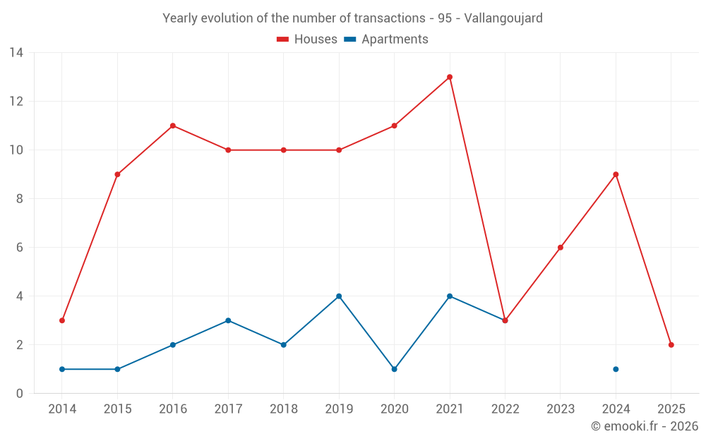 The median price on the 14 house transactions of the last 24 months in the municipality of Vallangoujard was 3 253 € per square meter for a median property value of 324 750 €. Over this period, 60% of transactions were between 2 607 and 3 639 € per square meter (from the 2nd to the 8th deciles).