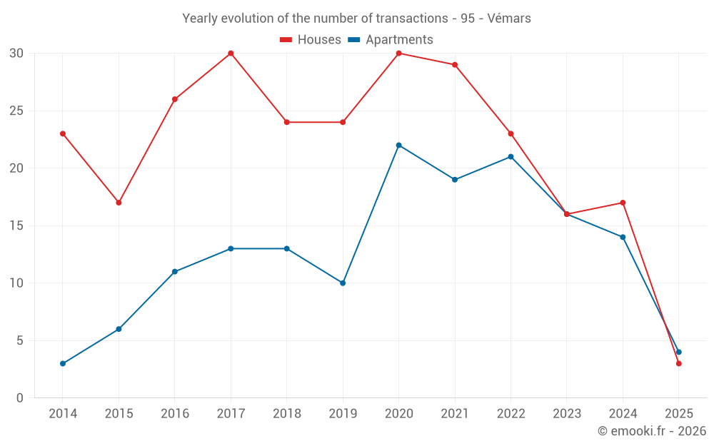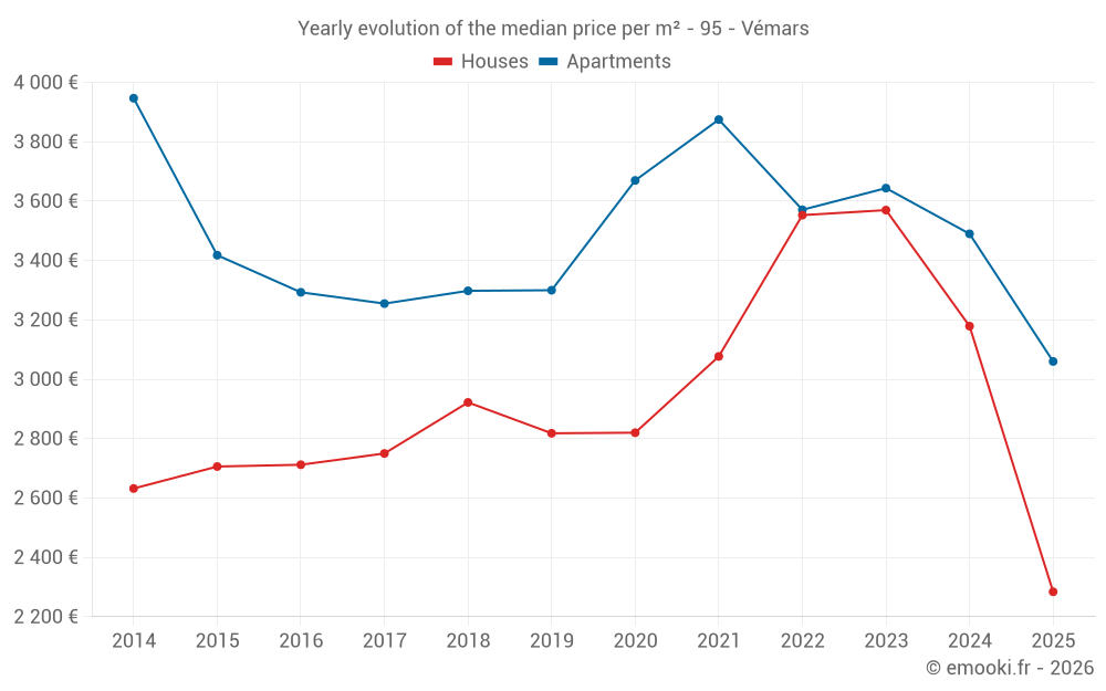 The median price on the 27 house transactions of the last 24 months in the municipality of Vémars was 3 125 € per square meter for a median property value of 267 000 €. Over this period, 60% of transactions were between 2 248 and 3 991 € per square meter (from the 2nd to the 8th deciles).