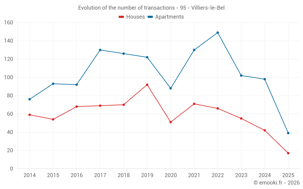 The median price on the 39 apartment transactions of the last 6 months in the municipality of Villiers-le-Bel was 2 351 € per square meter for a median property value of 135 000 €. Over this period, 60% of transactions were between 1 786 and 3 074 € per square meter (from the 2nd to the 8th deciles).