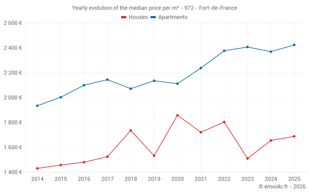 The median price on the 21 house transactions of the last 3 months in the municipality of Fort-de-France was 1 600 € per square meter for a median property value of 98 000 €. Over this period, 60% of transactions were between 859 and 2 424 € per square meter (from the 2nd to the 8th deciles).