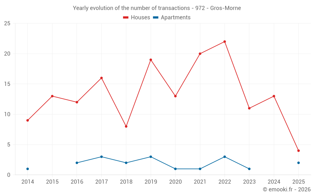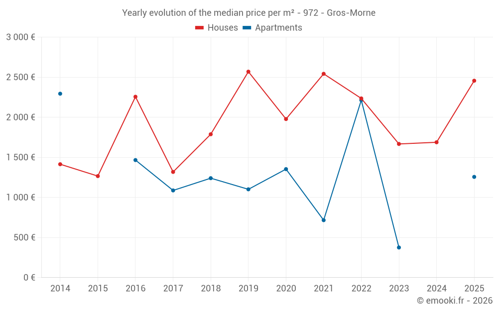 The median price on the 22 house transactions of the last 24 months in the municipality of Gros-Morne was 1 759 € per square meter for a median property value of 140 000 €. Over this period, 60% of transactions were between 1 153 and 3 046 € per square meter (from the 2nd to the 8th deciles).