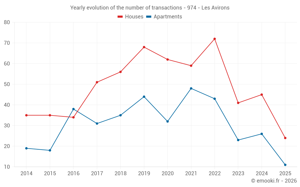 The median price on the 24 house transactions of the last 6 months in the municipality of Les Avirons was 3 033 € per square meter for a median property value of 299 868 €. Over this period, 60% of transactions were between 1 562 and 3 966 € per square meter (from the 2nd to the 8th deciles).