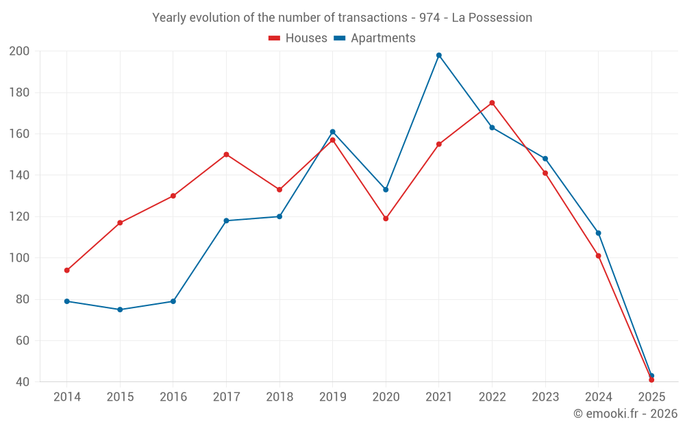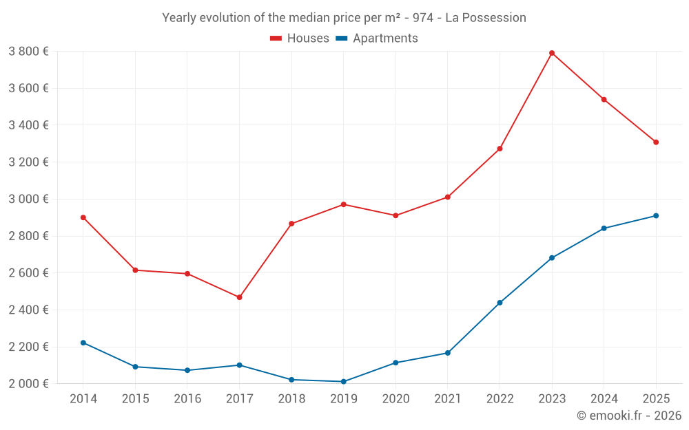 The median price on the 30 apartment transactions of the last 3 months in the municipality of La Possession was 2 908 € per square meter for a median property value of 151 184 €. Over this period, 60% of transactions were between 2 656 and 3 449 € per square meter (from the 2nd to the 8th deciles).