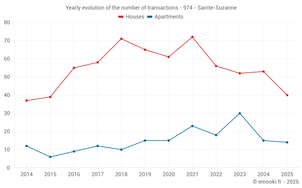 The median price on the 29 apartment transactions of the last 24 months in the municipality of Sainte-Suzanne was 2 375 € per square meter for a median property value of 130 000 €. Over this period, 60% of transactions were between 1 948 and 2 663 € per square meter (from the 2nd to the 8th deciles).