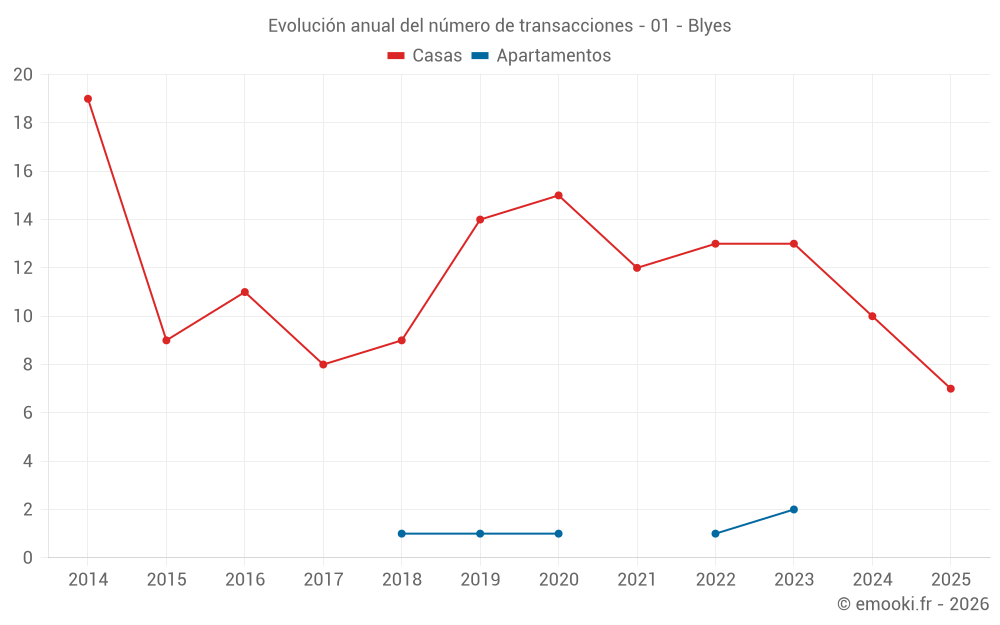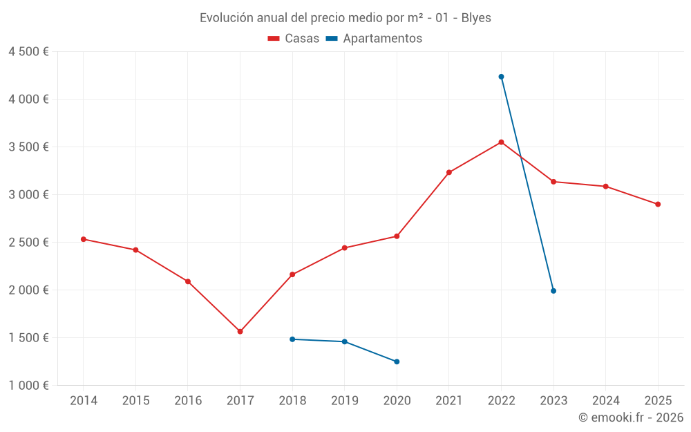 El precio mediano en las 28 transacciones de casas de los últimos 24 meses en la comuna de Blyes fue de 3 026 € por metro cuadrado para un valor patrimonial medio de 331 325 €. Durante este período el 60% de las transacciones estuvieron entre 2 291 y 3 653 € por metro cuadrado (del 2º al 8º decil).