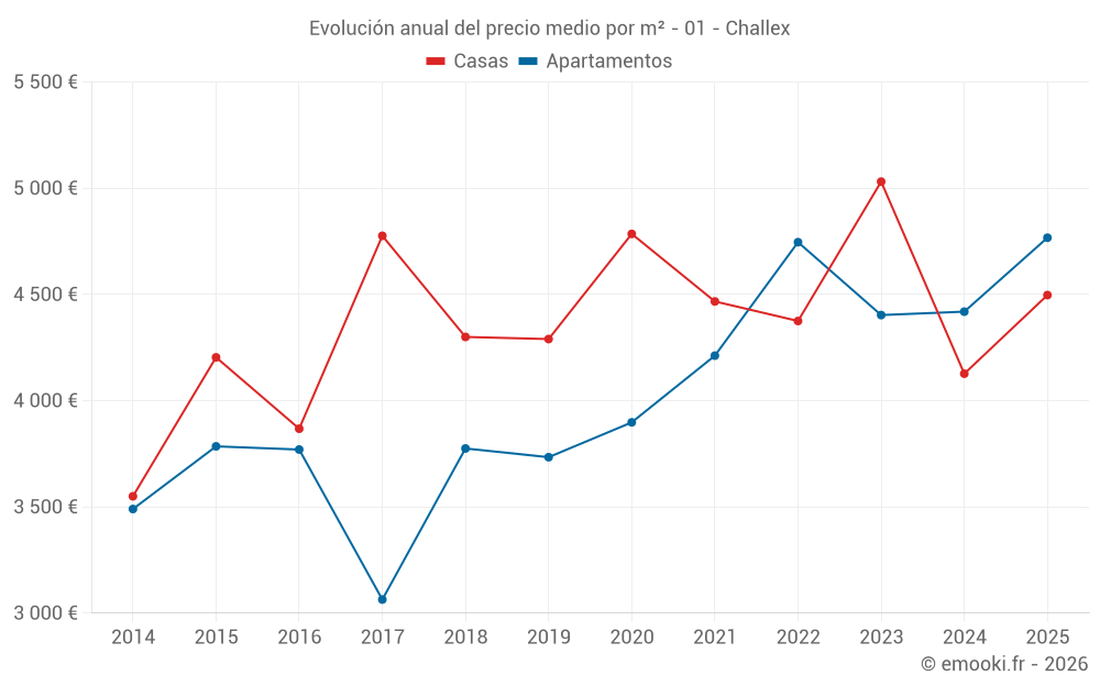 El precio mediano en las 18 transacciones de casas de los últimos 24 meses en la comuna de Challex fue de 4 515 € por metro cuadrado para un valor patrimonial medio de 541 329 €. Durante este período el 60% de las transacciones estuvieron entre 2 875 y 5 556 € por metro cuadrado (del 2º al 8º decil).