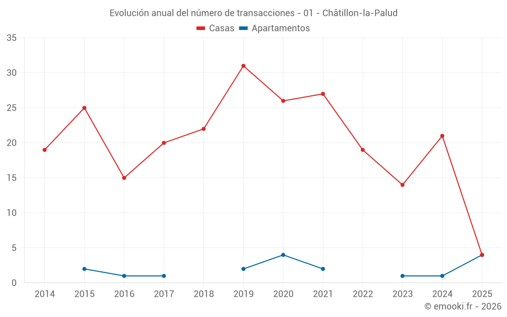 El precio mediano en las 31 transacciones de casas de los últimos 24 meses en la comuna de Châtillon-la-Palud fue de 2 697 € por metro cuadrado para un valor patrimonial medio de 225 000 €. Durante este período el 60% de las transacciones estuvieron entre 1 964 y 3 084 € por metro cuadrado (del 2º al 8º decil).