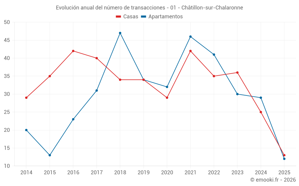 El precio mediano en las 32 transacciones de casas de los últimos 12 meses en la comuna de Châtillon-sur-Chalaronne fue de 2 798 € por metro cuadrado para un valor patrimonial medio de 301 000 €. Durante este período el 60% de las transacciones estuvieron entre 2 191 y 3 512 € por metro cuadrado (del 2º al 8º decil).
